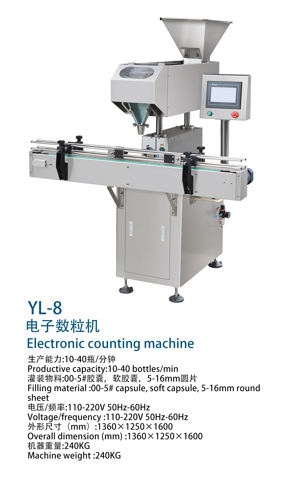 灌裝物料 Filling material range | 5#~00#膠囊、軟膠囊,ф5.5~12素片、異形片、糖衣片,ф5~12丸劑 5#-000#capsule、softgel、?5.5~12mmRound tablet、 Abnormal shape、Icing tablets、?5~12mmpill |