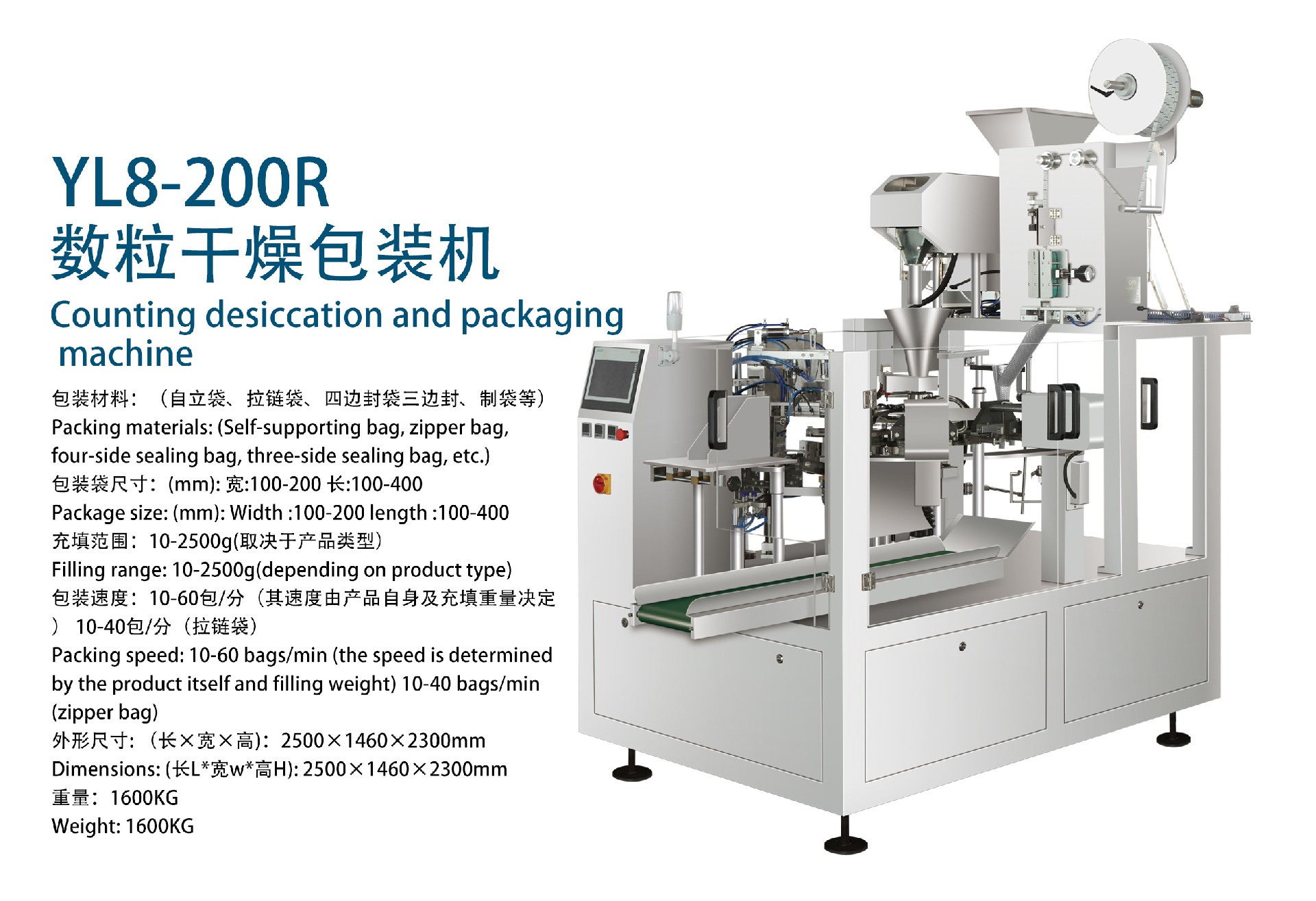 包裝速度:10-60包/分(其速度由產(chǎn)品自身及充填重量決定) 10-40包/分(拉鏈袋)
